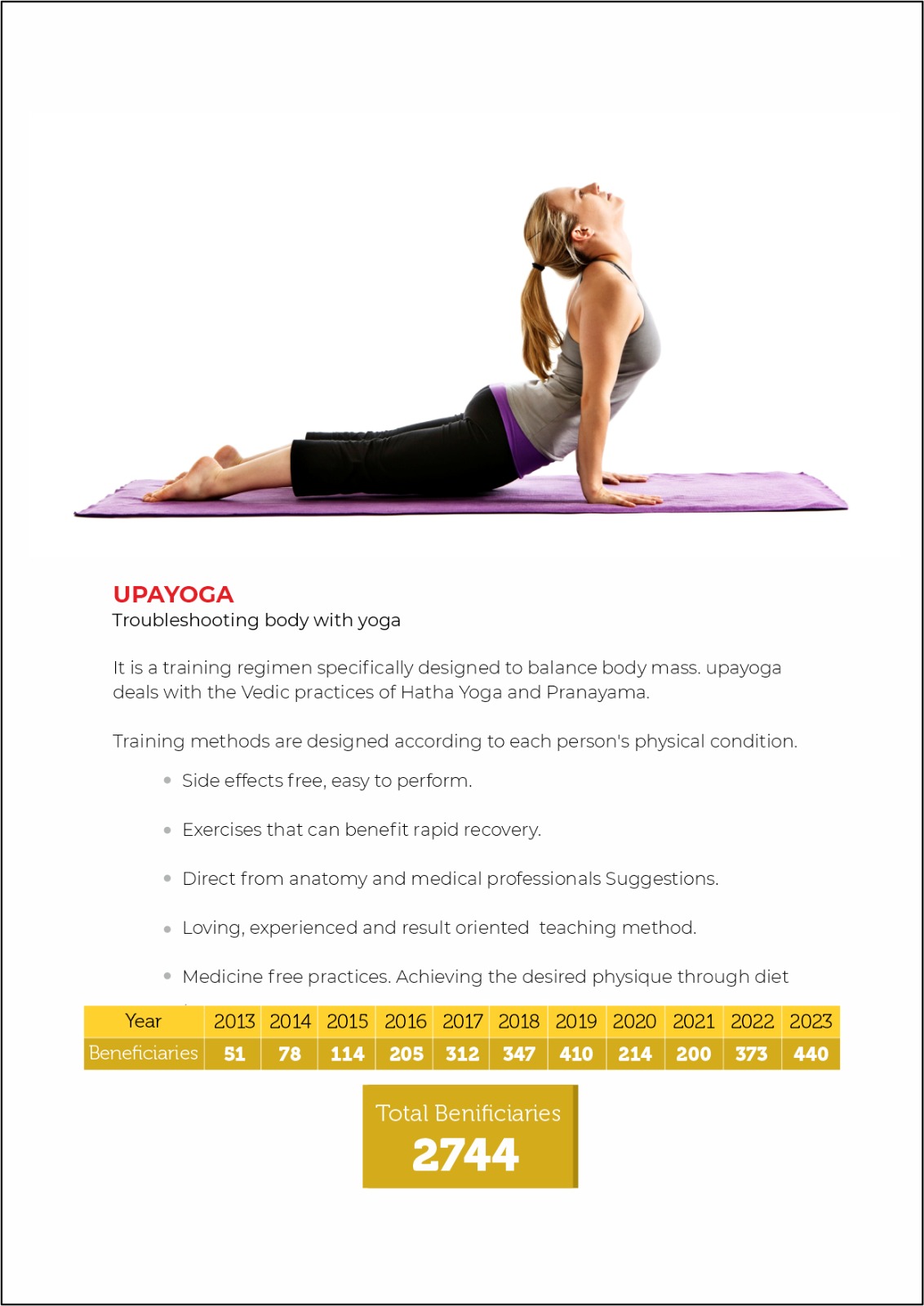 The training methods in Upayoga are designed to be side-effect-free and easy to perform, making them accessible to individuals of all ages and physical abilities. These exercises are specifically selected to benefit rapid recovery and promote overall well-being.
