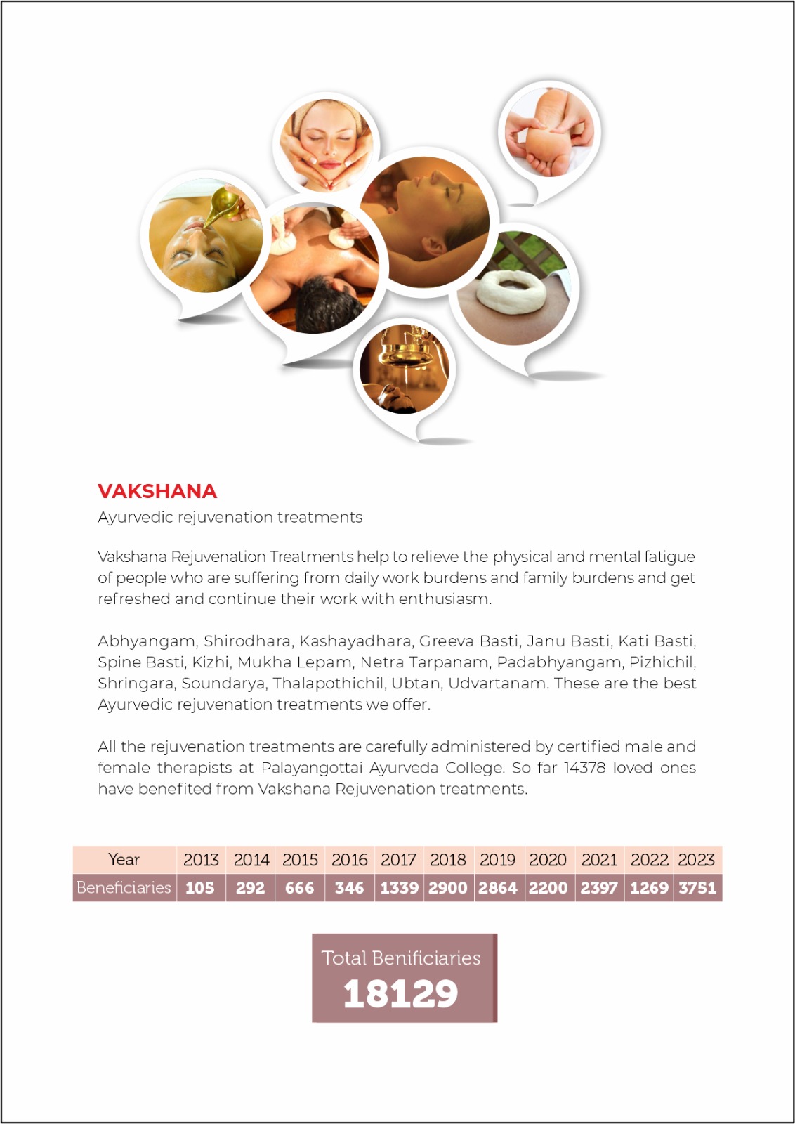 Vakshana Rejuvenation Treatments help to relieve the physical and mental fatigue of people who are suffering from daily work burdens and family burdens and get refreshed and continue their work with enthusiasm. Abhyangam, Shirodhara, Kashayadhara, Greeva Basti, Janu Basti, Kati Basti, Spine Basti, Kizhi, Mukha Lepam, Netra Tarpanam, Padabhyangam, Pizhichil, Shringara, Soundarya, Thalapothichil, Ubtan, Udvartanam. These are the best Ayurvedic rejuvenation treatments we offer. All the rejuvenation treatments are carefully administered by certified male and female therapists at Palayangottai Ayurveda College. So far 18129+ loved ones have benefited from Vakshana Rejuvenation treatments.